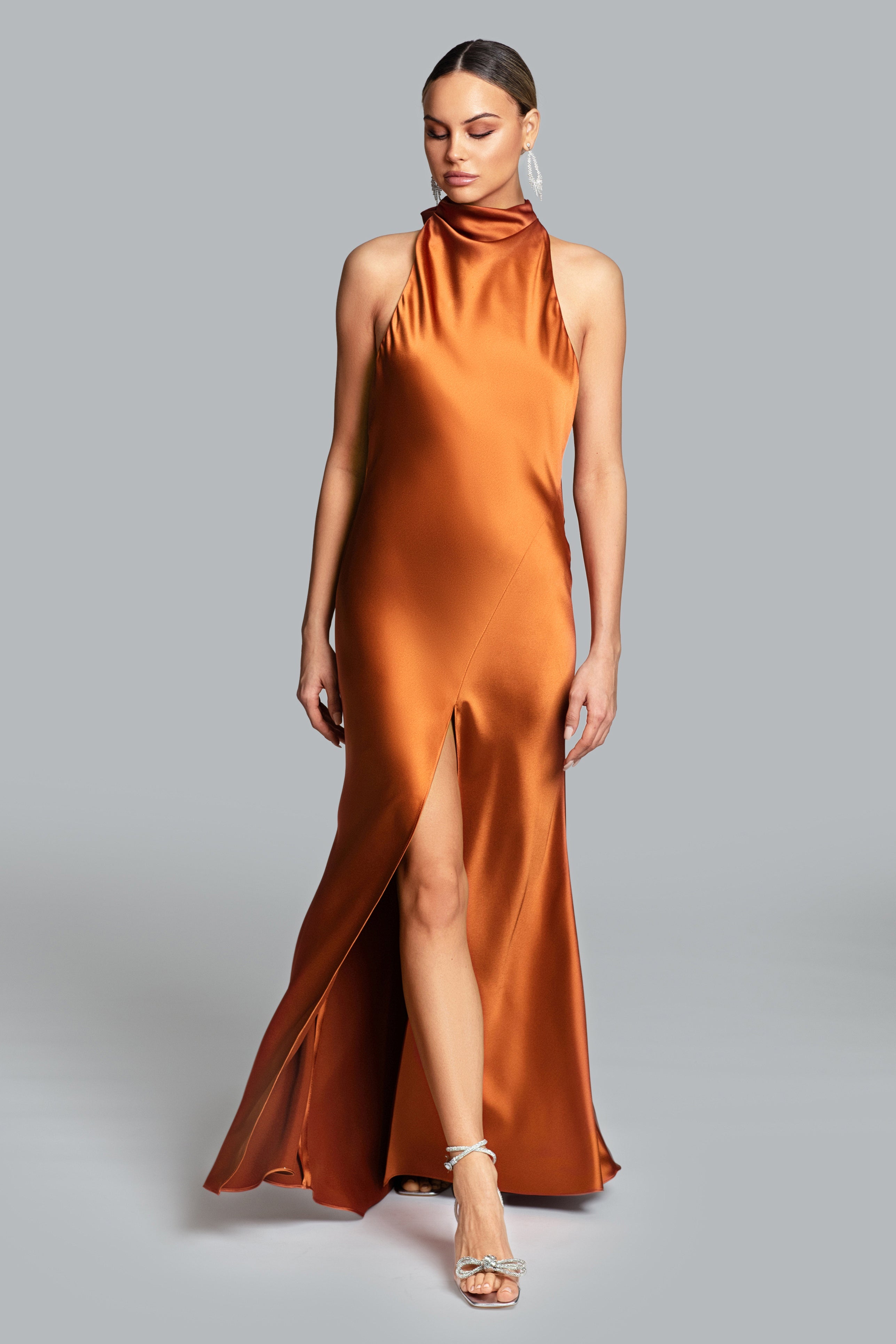 The Ghrail "Bond" Satin Gown emerges as a stellar option for bridesmaids, boasting a luxurious satin fabric and an elegant draped mock neckline that exudes sophistication. Its cascading ties at the back add a unique touch, complementing diverse body types with style. The inclusion of a sexy center front slit strikes a balance between allure and refinement, ensuring an elegant yet alluring aesthetic. Moreover, the low back design not only adds drama but also offers ease of wear, facilitating comfort and convenience throughout the wedding festivities. Overall, this gown presents bridesmaids with a chic and glamorous ensemble, instilling confidence and beauty as they stand beside the bride on her momentous day. Its versatility and flattering silhouette make it an exceptional choice for any bridal party.