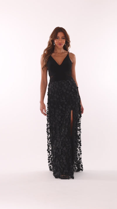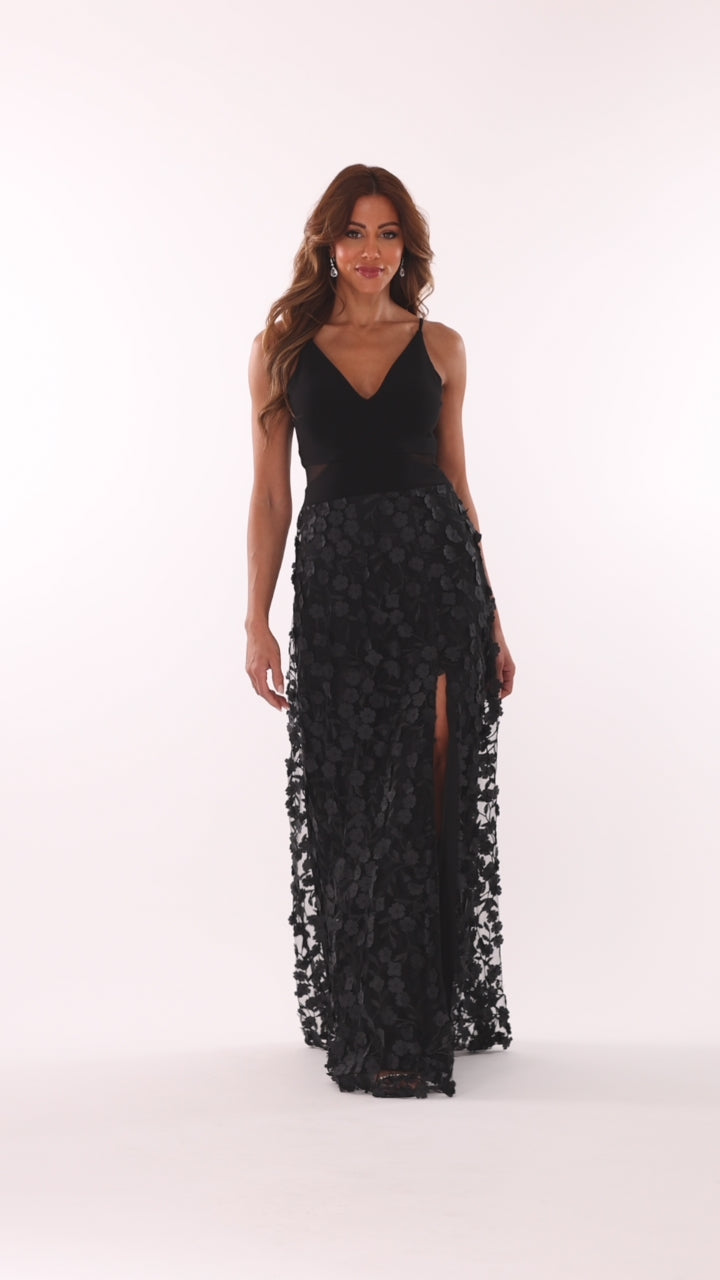 - Details: V-Neck, Illusion Cut Outs, Raised Flowers, Slit in Skirt