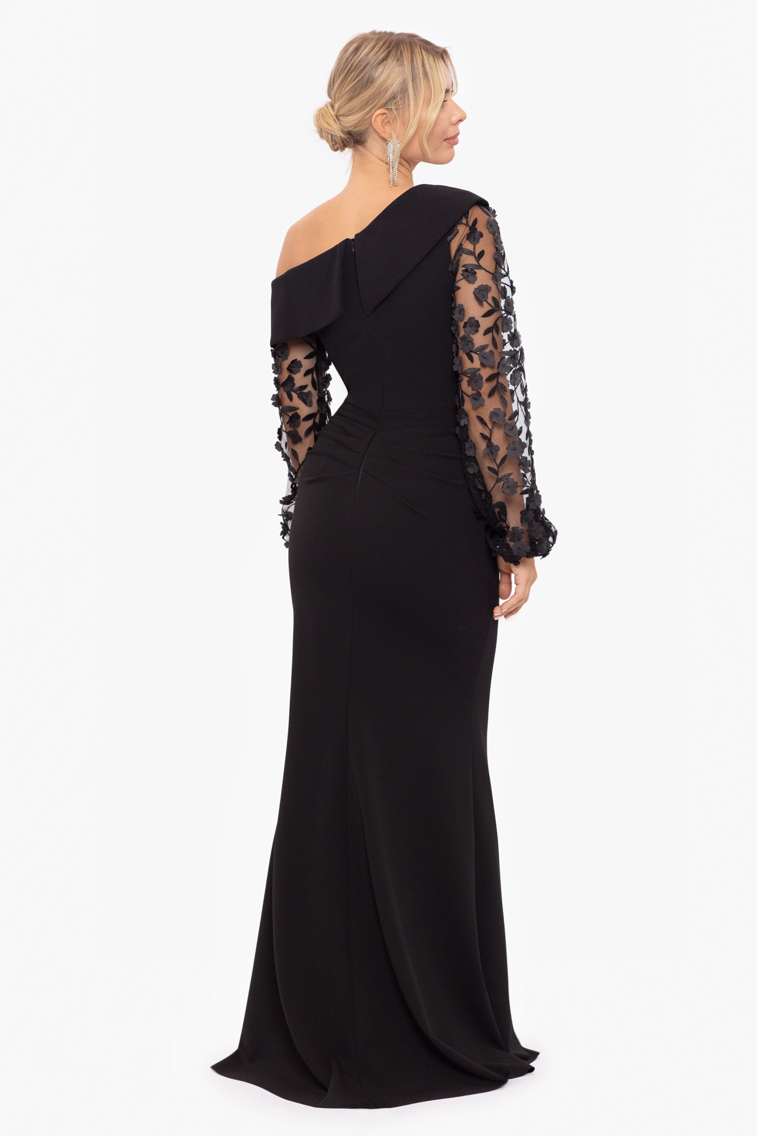 • Details: Off the Shoulder, Ruching on Waist, Illusion Sleeves with Raised Flowers