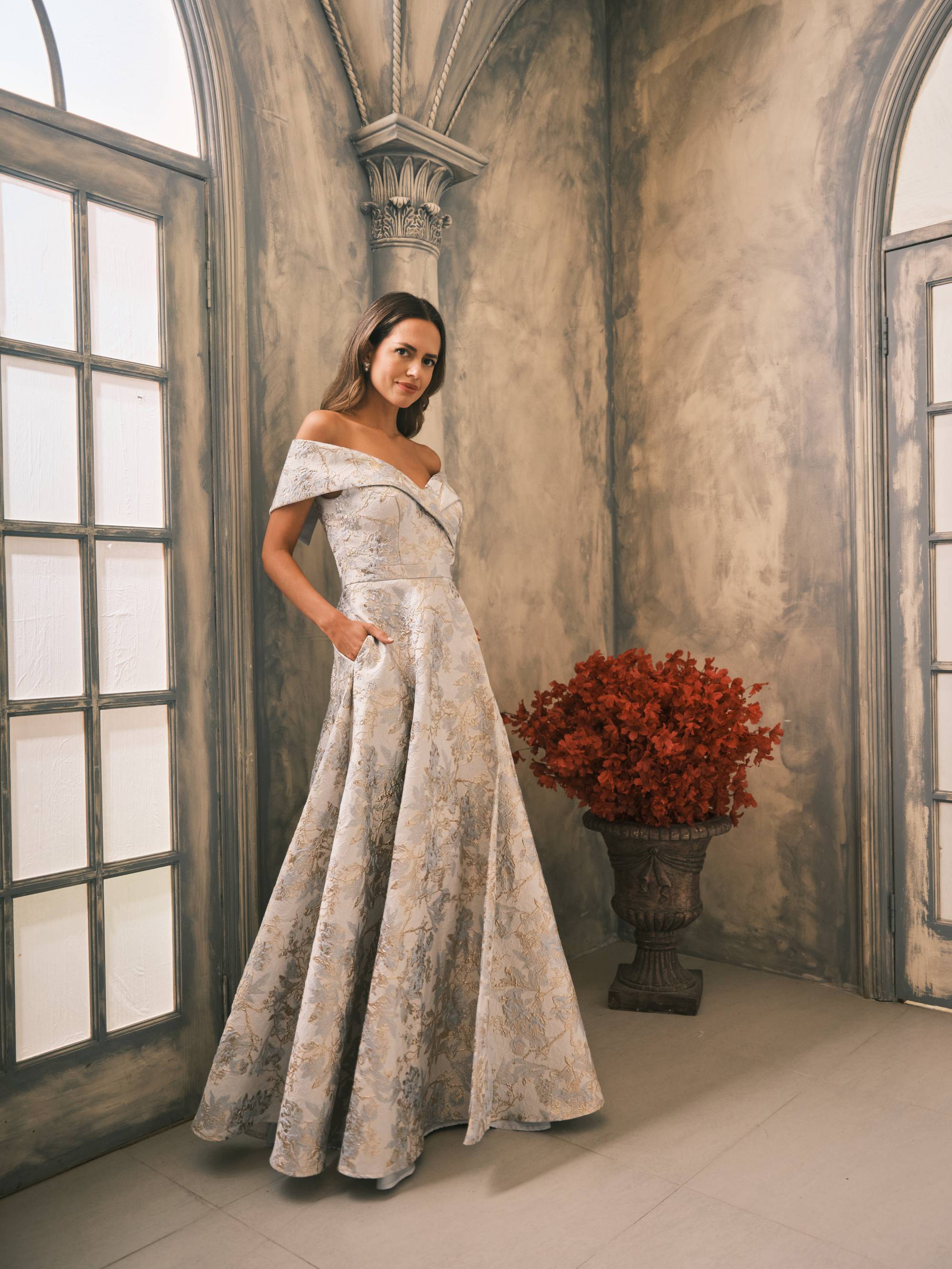 Step into elegance with this off-the-shoulder jacquard gown, designed to captivate. Featuring a structured bodice and a full sweeping skirt, this dress effortlessly combines modern sophistication with timeless charm. Side pockets add a functional touch to this glamorous silhouette.