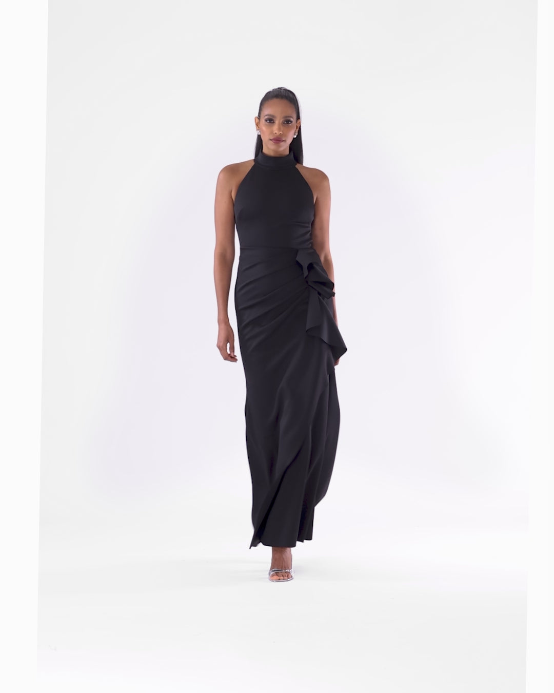 A sleek high neckline and sculpted waist detail bring elevated elegance to this floor-length gown. Clean lines and a dramatic ruffle make this a standout look for formal weddings, galas, and black-tie affairs.