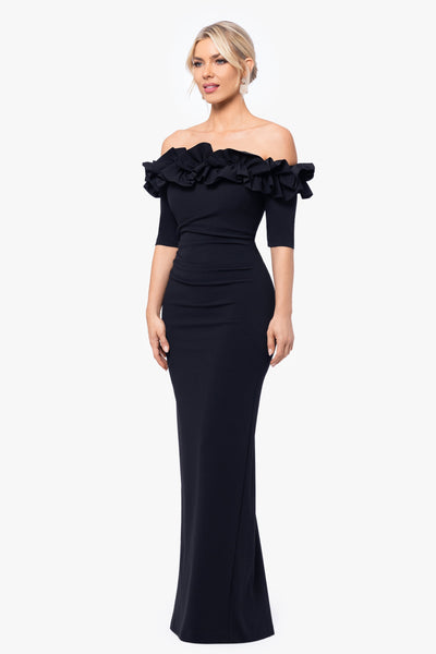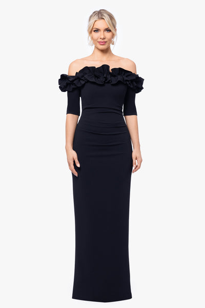 "Isla" Long Crepe Off the Shoulder Ruffle Dress