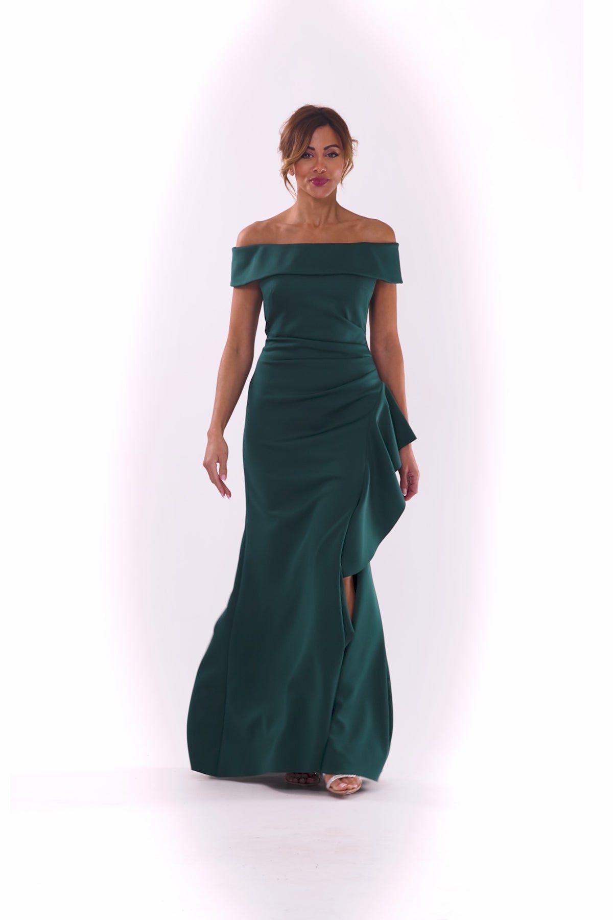 "Dolly" Techno Scuba Off the Shoulder Ruffle Floor Length Dress