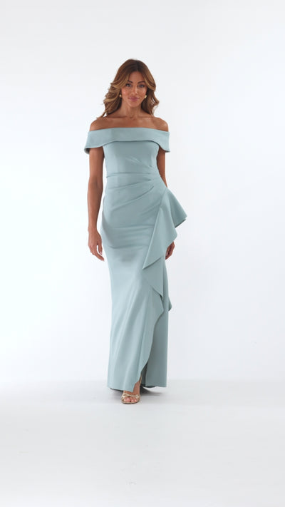 Turn heads in this off-the-shoulder gown featuring a figure-flattering silhouette and a cascading ruffle detail. The elegant design and floor-length style make it perfect for weddings, galas, or evening events. Effortlessly chic, this dress combines timeless sophistication with modern flair.