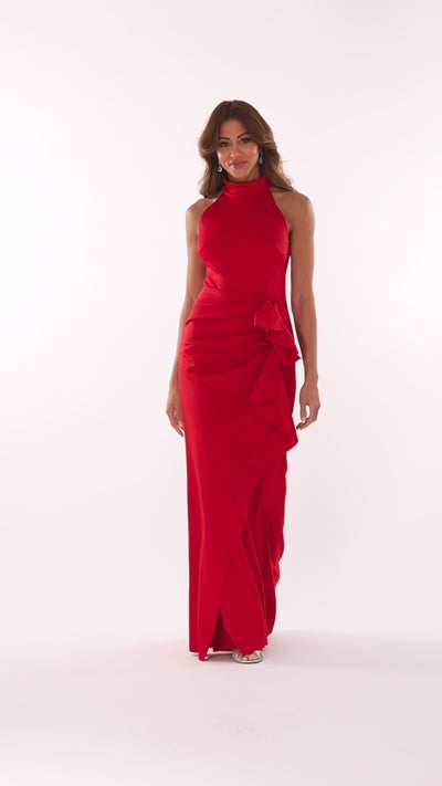 A sleek high neckline and sculpted waist detail bring elevated elegance to this floor-length gown. Clean lines and a dramatic ruffle make this a standout look for formal weddings, galas, and black-tie affairs.