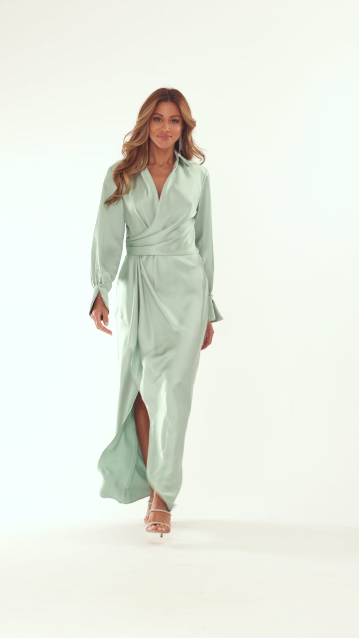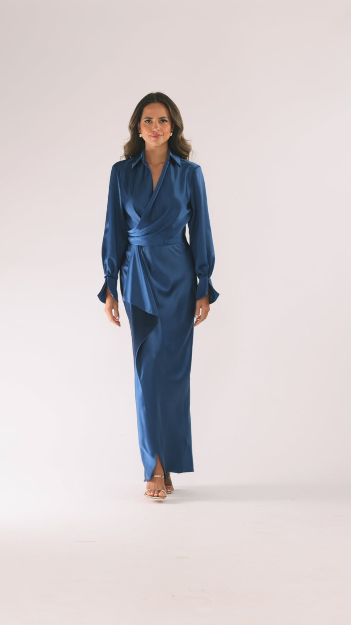 This sophisticated gown combines the classic elegance of a wrap dress with a sleek satin finish, offering a refined look for formal events. The tailored collar and long sleeves add a structured element, while the draped skirt enhances movement and grace. Ideal for making a powerful yet feminine statement, this gown embodies both luxury and style.