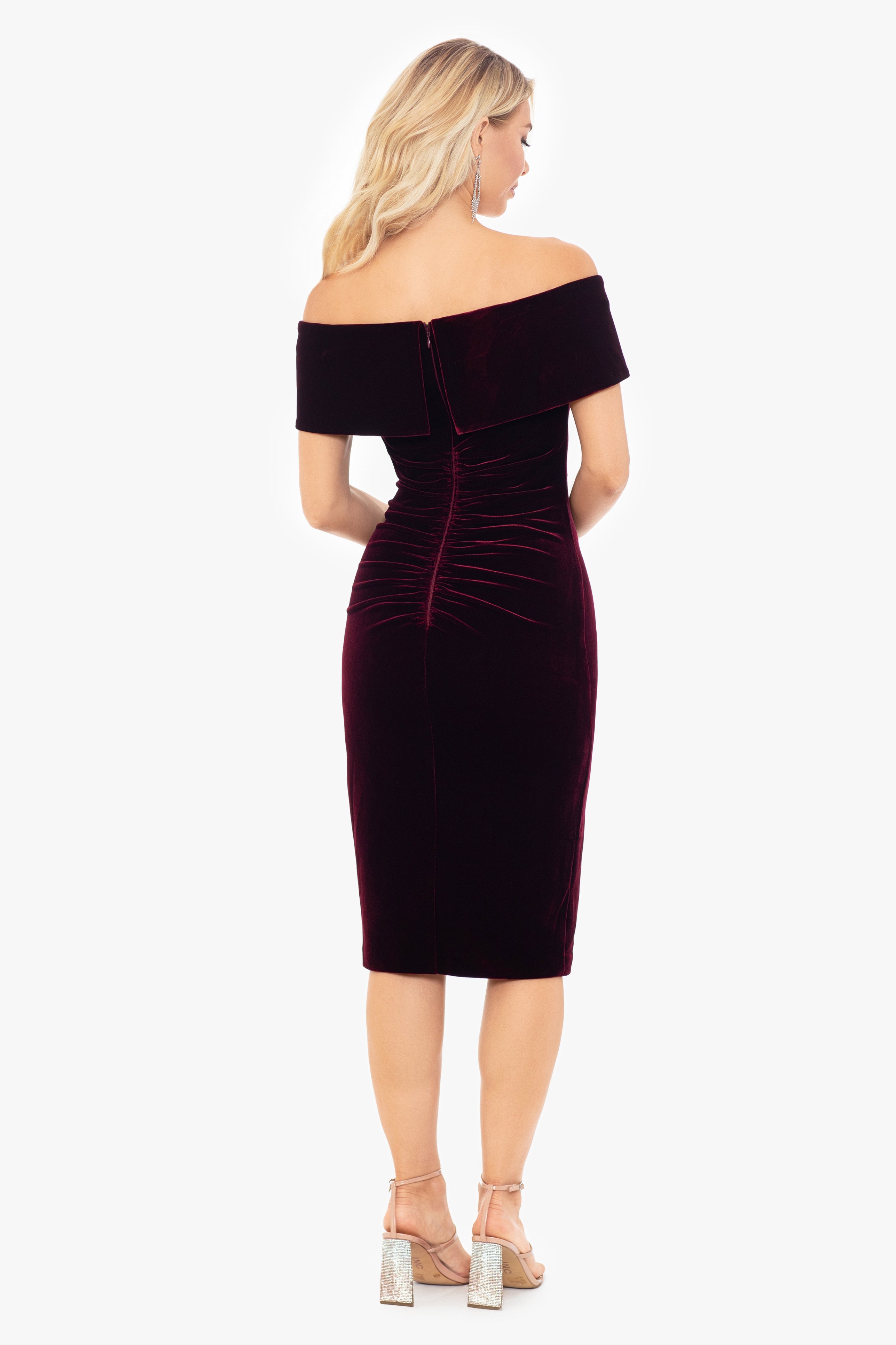 "Felicity" Knee Length Off the Shoulder Ruched Velvet Dress