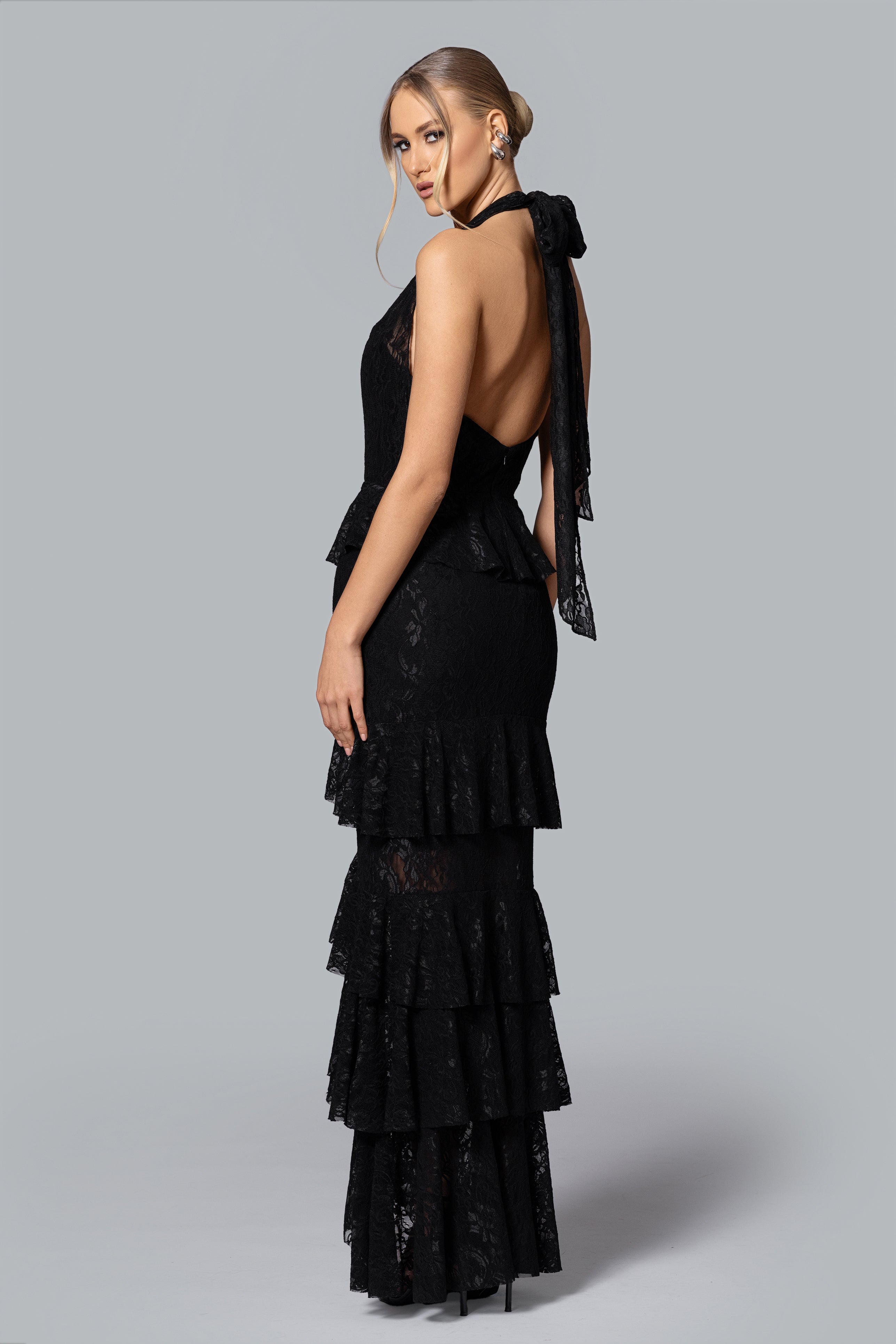 This dress features a stunning lace design with a flattering peplum waist and tiered skirt for an elegant silhouette. The plunging neckline and halter-style straps add a touch of daring sophistication. Perfect for any evening affair, it combines boldness with timeless charm.