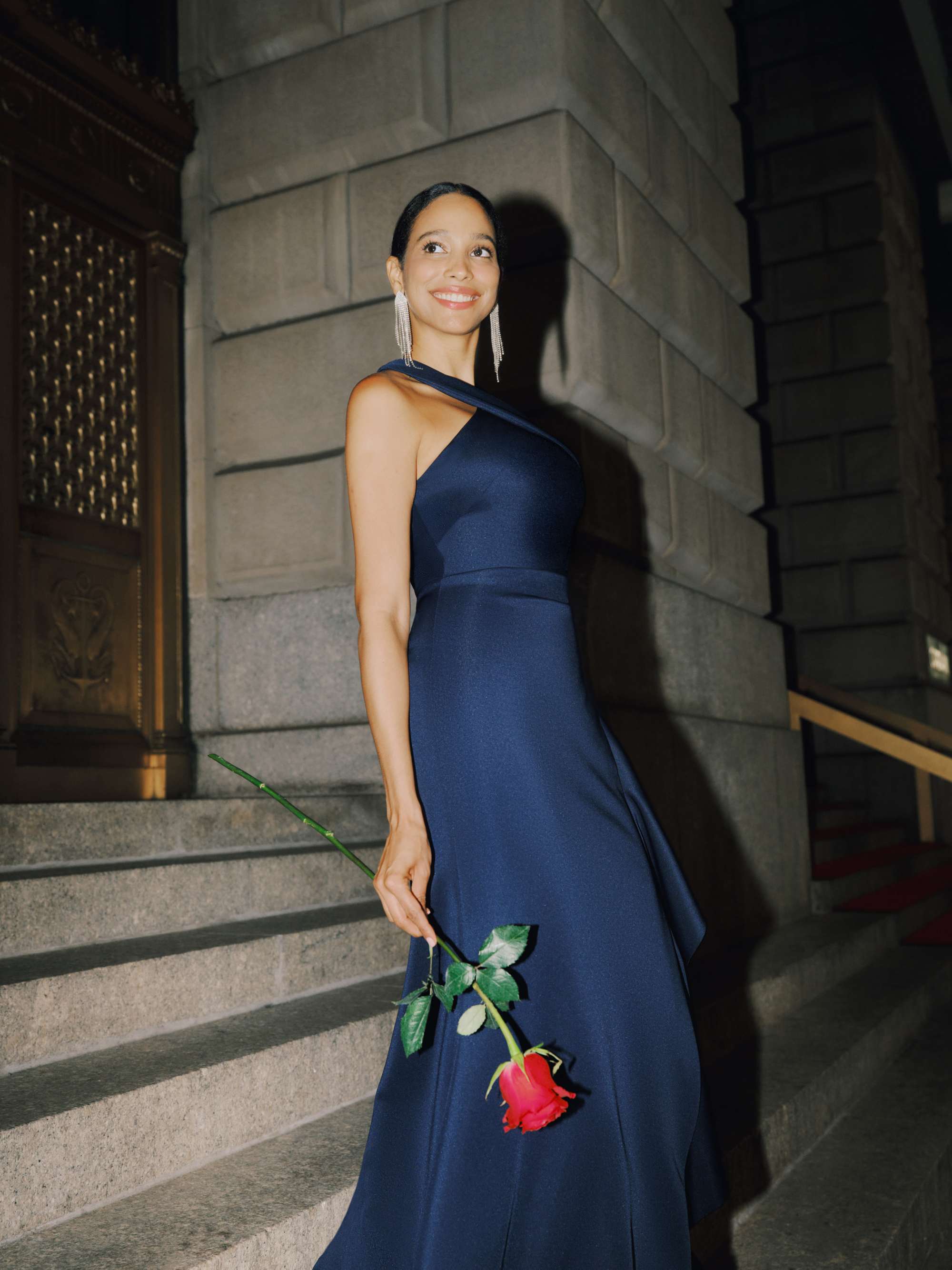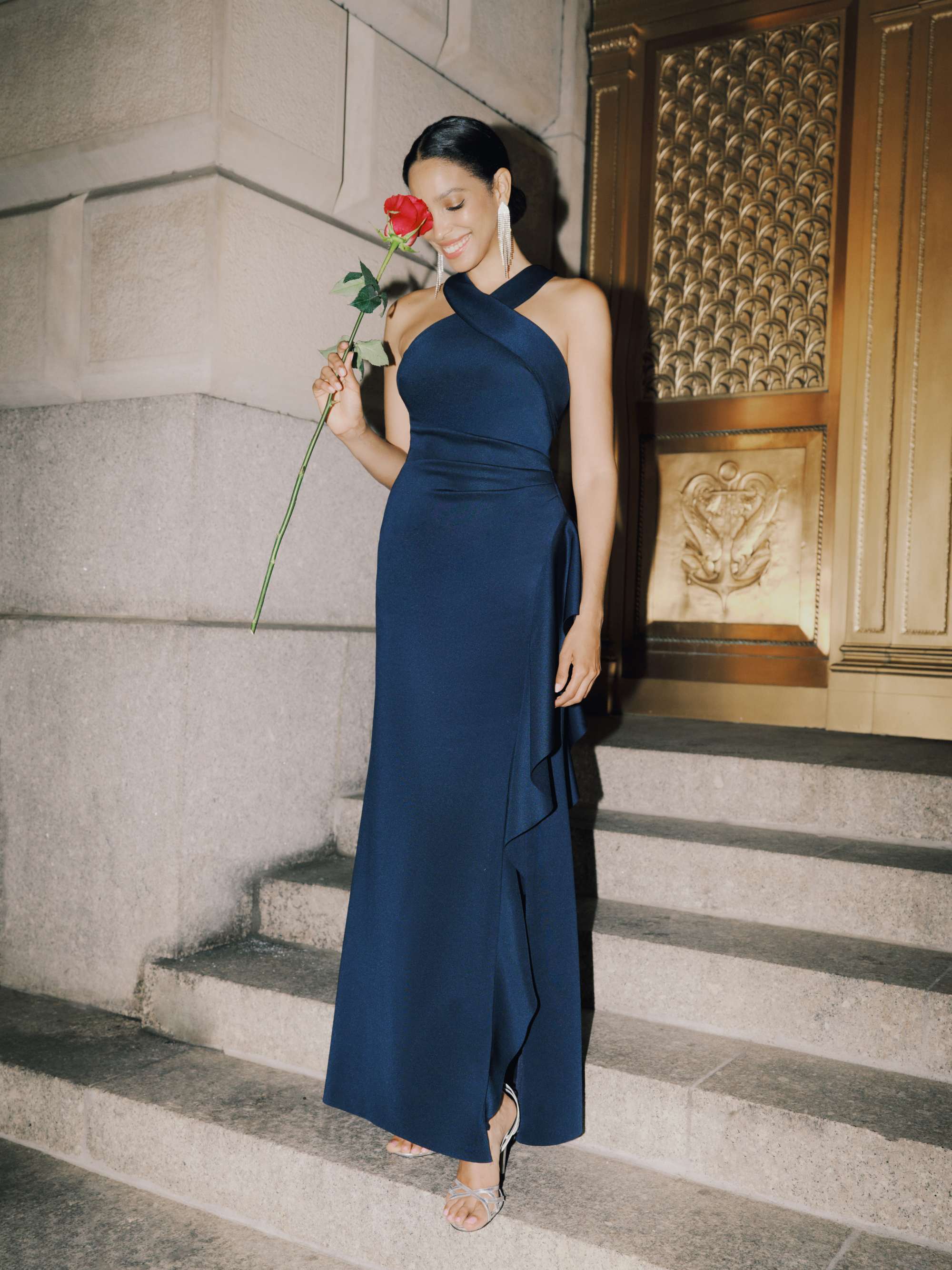 This sophisticated gown showcases a halter neckline with an elegant crossover design, emphasizing the shoulders. A cascading ruffle detail gracefully adorns the skirt, adding movement and flair to its form-fitting silhouette. Perfect for formal occasions, this dress exudes timeless charm.