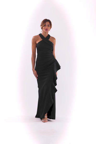 This sophisticated gown showcases a halter neckline with an elegant crossover design, emphasizing the shoulders. A cascading ruffle detail gracefully adorns the skirt, adding movement and flair to its form-fitting silhouette. Perfect for formal occasions, this dress exudes timeless charm.