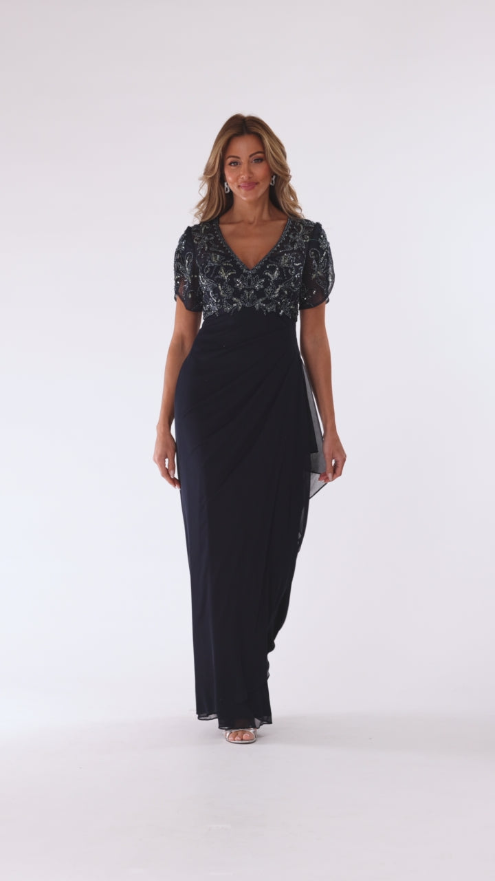 "Giselle" Sheer Jersey Beaded V-Neck Floor Length Dress