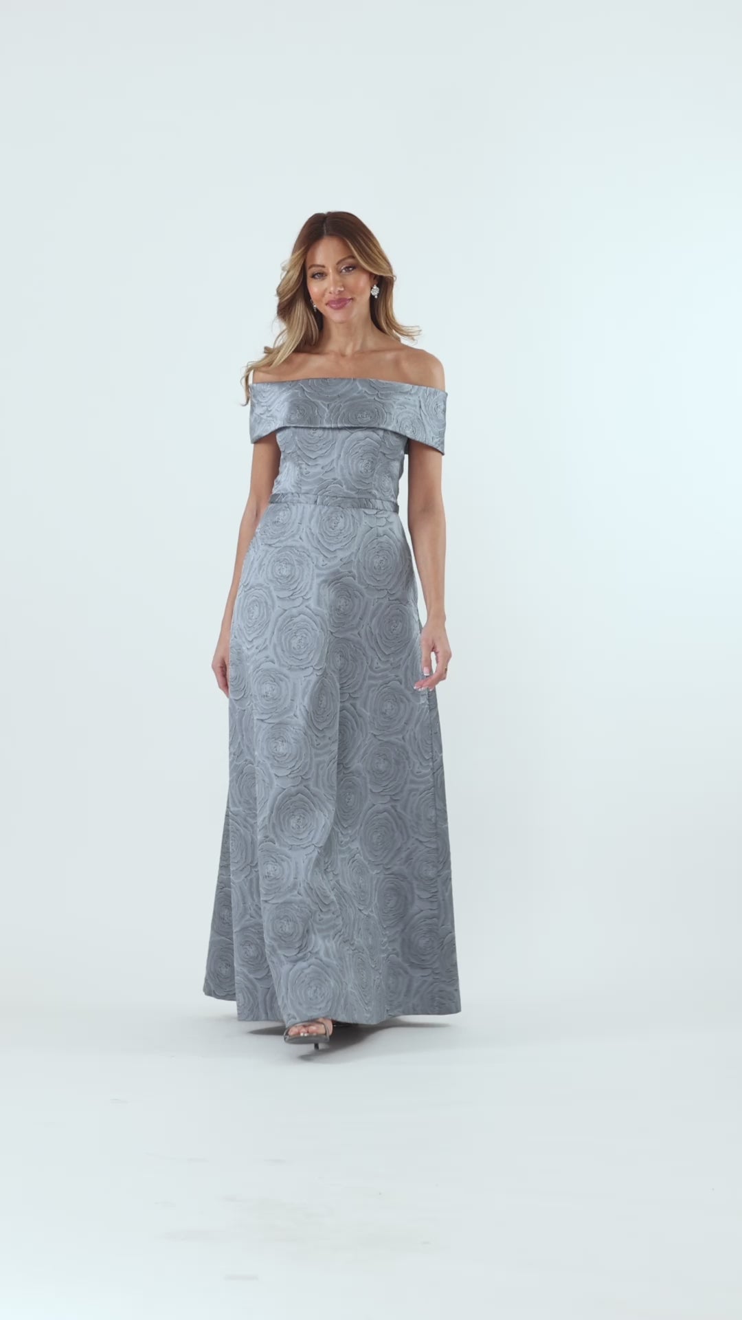 This elegant gown features a beautifully textured rose jacquard fabric that adds depth and dimension. The off-the-shoulder neckline gracefully frames the collarbone, while the fitted bodice enhances the waist for a flattering silhouette. Flowing into a floor-length A-line skirt, the design creates a timeless and refined look. Perfect for formal evenings, weddings, or special occasions, this gown blends classic romance with modern sophistication.