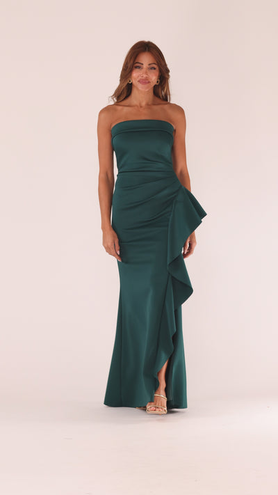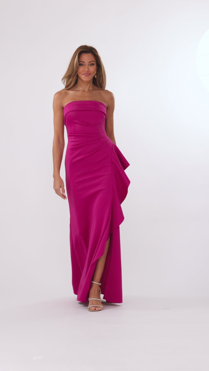 • Details: Strapless, Leg Slit, Straight Neckline, Ruffle Detail