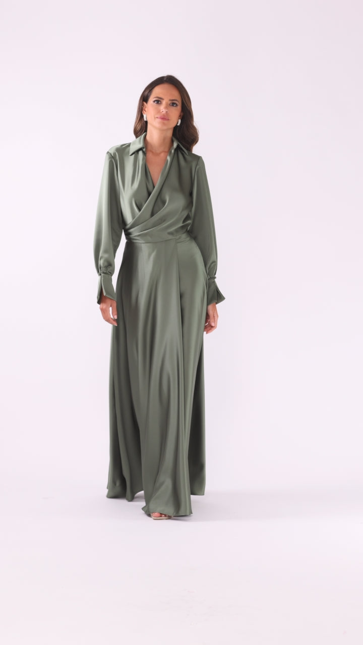 "Kelandra" Satin Collared V-Neck Long Sleeve Floor Length Dress