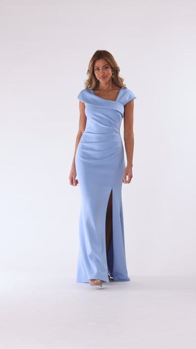 Elevate your evening with this sophisticated cap-sleeve gown, featuring an elegant asymmetric neckline for a modern twist. The fitted bodice and floor-length skirt with a chic front slit create a flattering silhouette, perfect for weddings, formal events, and upscale gatherings. Crafted for timeless appeal, this dress combines contemporary style with classic charm.