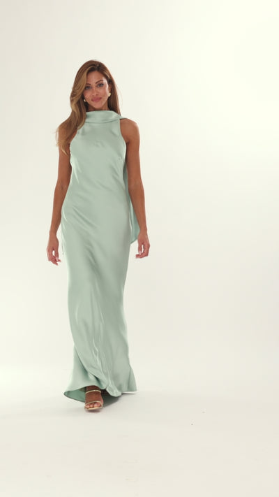A sleek sleeveless gown featuring a high neckline and clean, minimalist silhouette. The softly structured bodice flows into a floor-length skirt with effortless drape, creating a refined, modern look ideal for formal events, weddings, and elegant evening occasions.