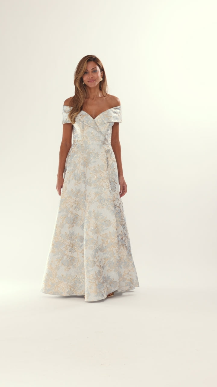 Step into elegance with this off-the-shoulder jacquard gown, designed to captivate. Featuring a structured bodice and a full sweeping skirt, this dress effortlessly combines modern sophistication with timeless charm. Side pockets add a functional touch to this glamorous silhouette.