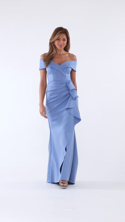 Upgrade your wardrobe with the "Patti" Long Off the Shoulder Scuba Crepe Dress. Made from high-quality Scuba Crepe material and fully lined for comfort, this dress features a hidden back zipper for a seamless finish. The off the shoulder design, folded top, and ruffle detail add a touch of elegance and sophistication to any occasion.
