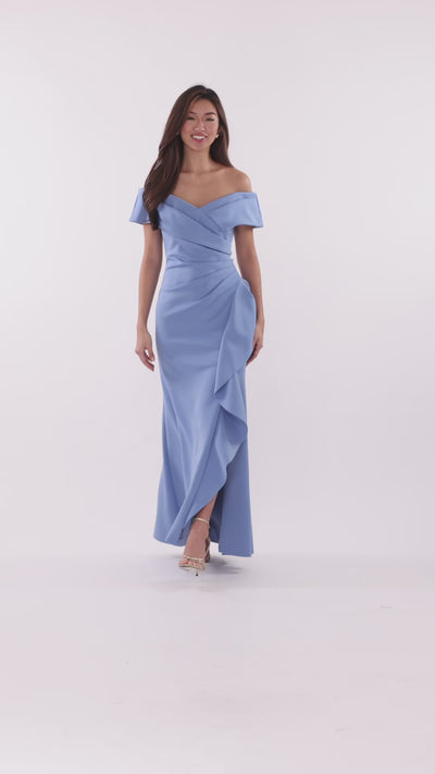 This floor-length dress features an elegant off-the-shoulder design adorned with delicate ruffles, crafted from smooth techno scuba fabric that offers a flattering fit and comfortable stretch. Its sleek silhouette enhances poise and grace, making it perfect for formal events or sophisticated evenings. The structured material ensures a polished look while providing ease of movement, combining style with comfort effortlessly.