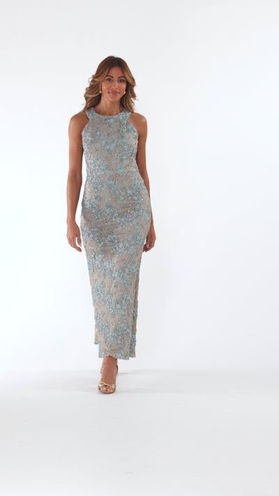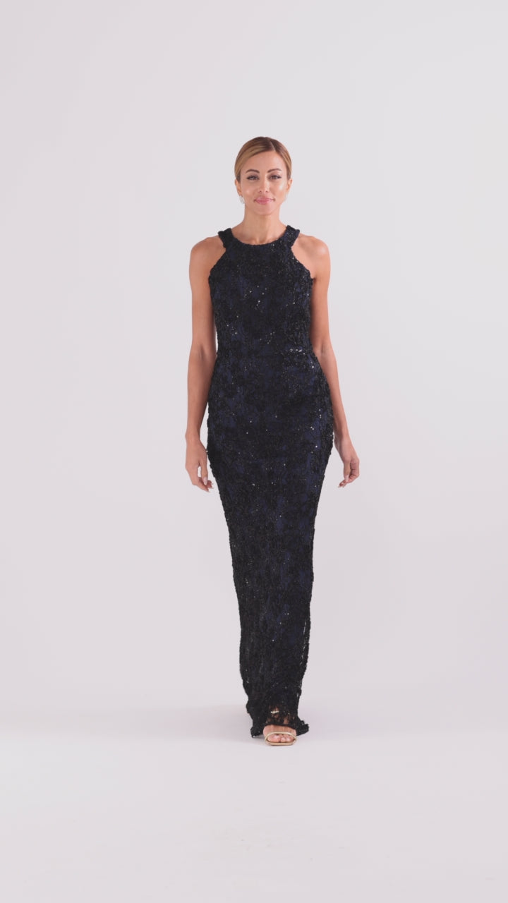 Petite "Andrea" Halter Neck Soutache Lace Floor Length Dress