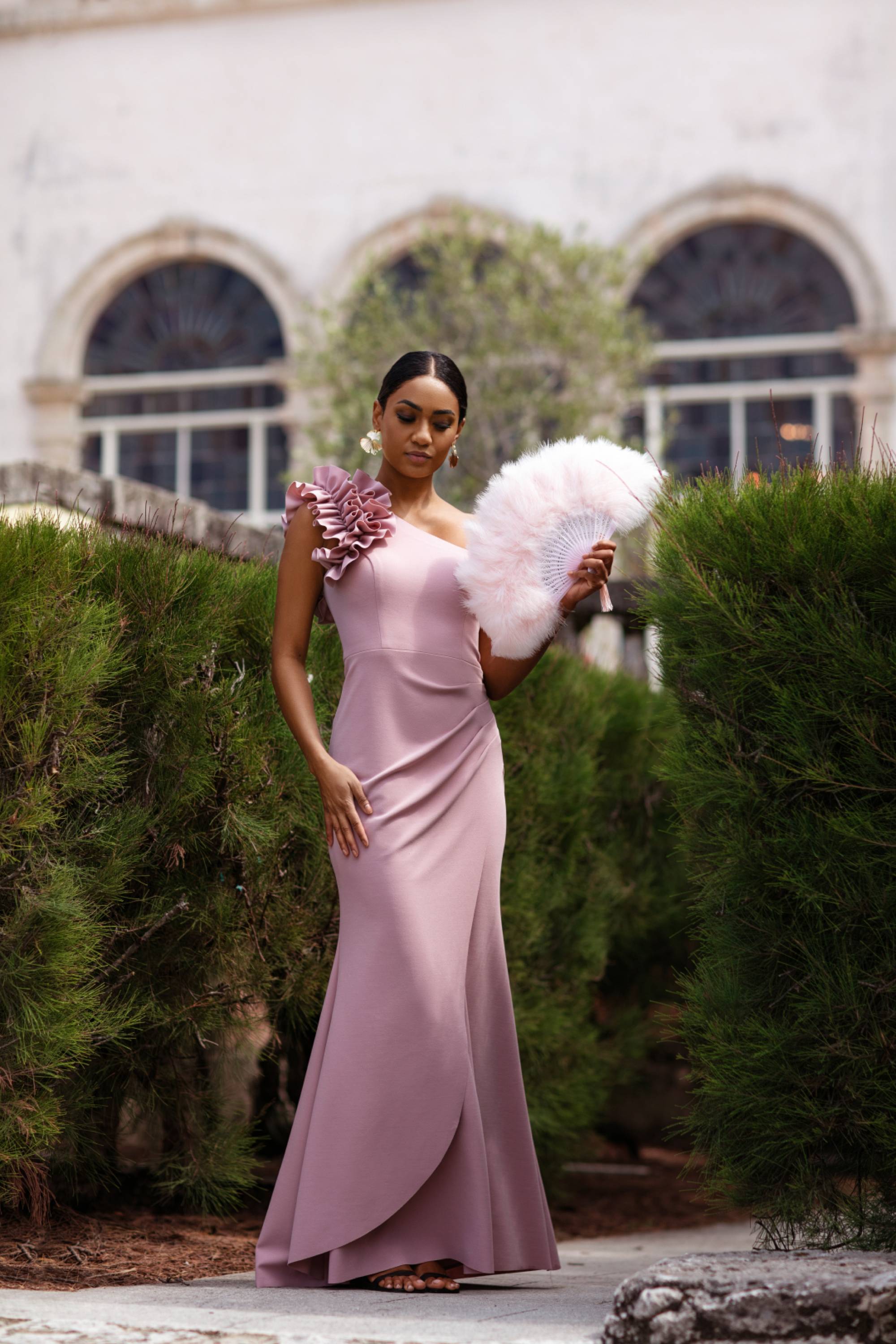 - Details: One Shoulder, Ruffle Detail on Shoulder, Ruched Side