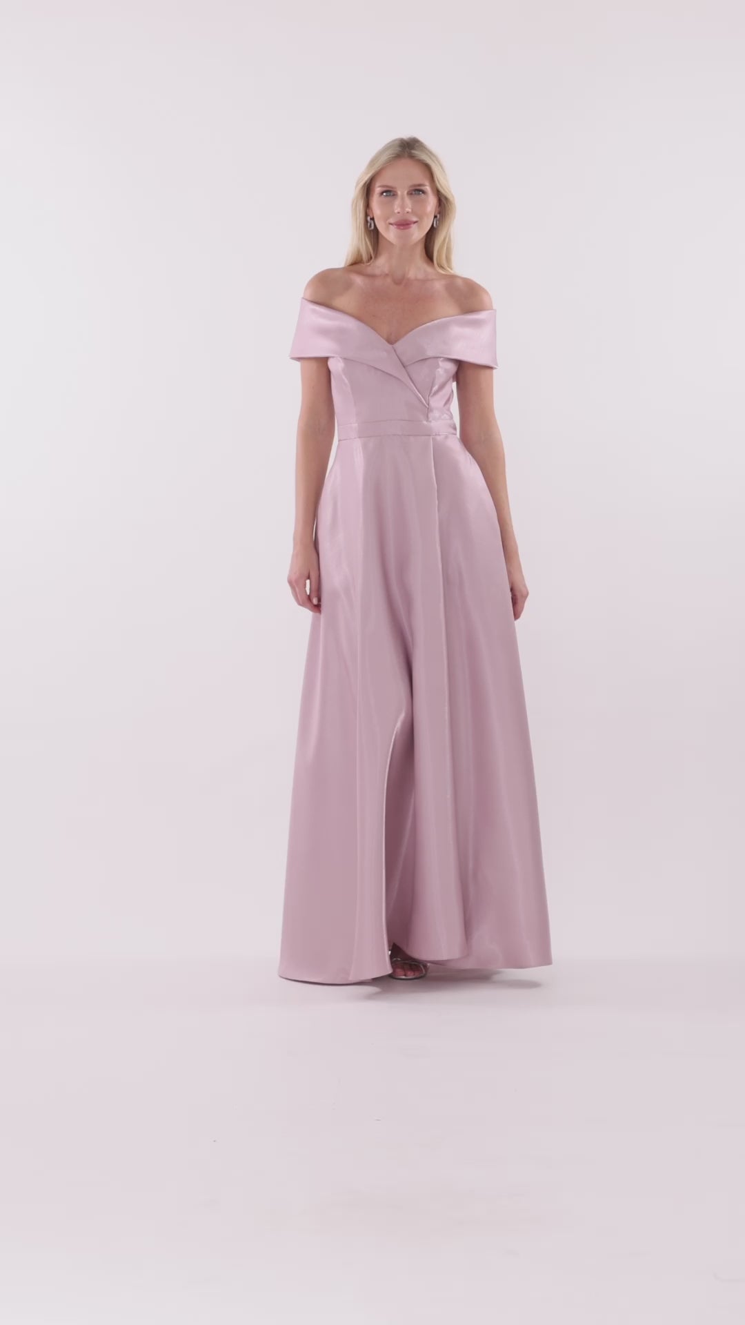 This elegant floor-length gown features a refined off-the-shoulder neckline that beautifully frames the shoulders and collarbone. Designed with a structured bodice for a sculpted, supportive fit, it flows into a full A-line skirt that creates graceful movement and balanced proportion. Crafted from smooth mikado with a soft sheen, the silhouette offers timeless sophistication, clean lines, and a polished finish that feels both classic and confidently modern.