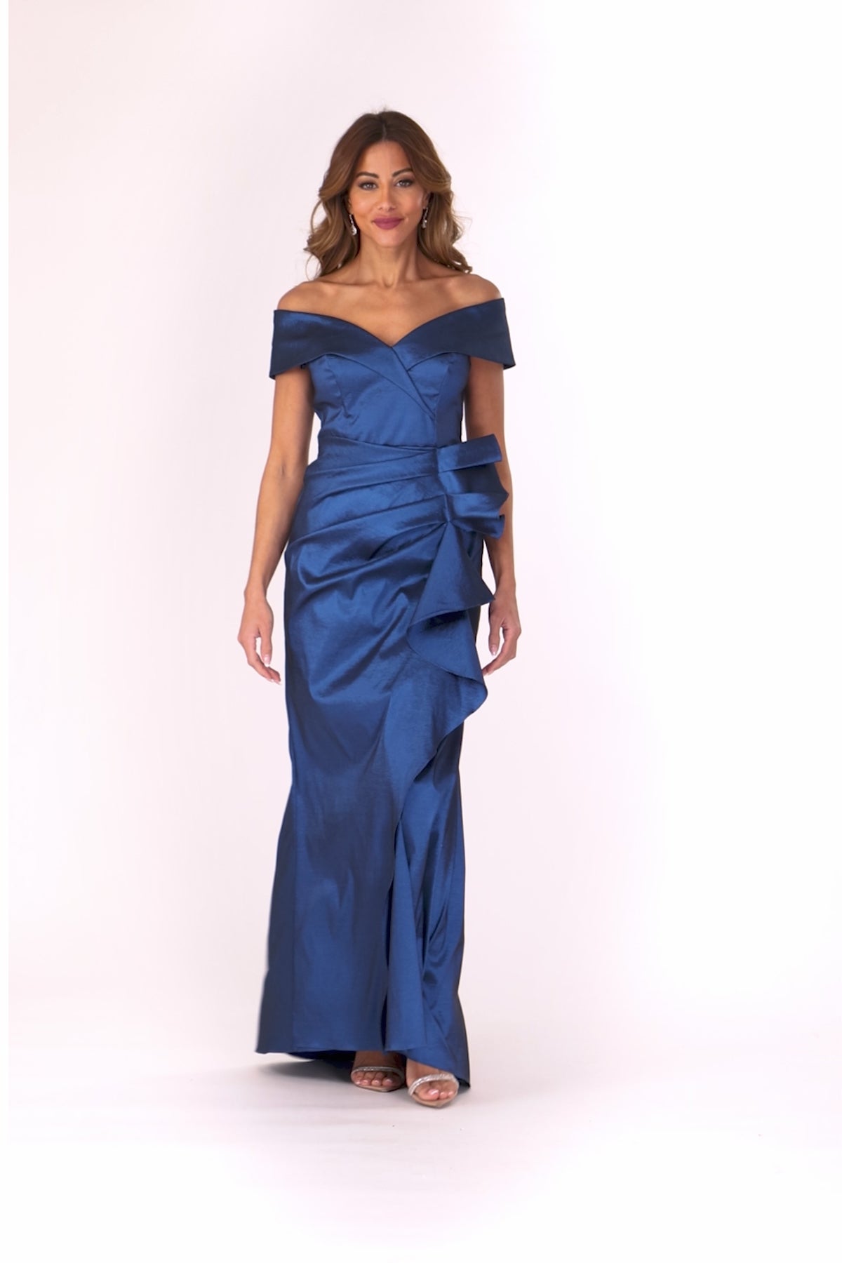 Turn heads in this off-the-shoulder gown crafted from structured taffeta. Featuring elegant pleating and a dramatic side drape, this figure-flattering style delivers modern sophistication perfect for weddings, galas, and formal evenings.