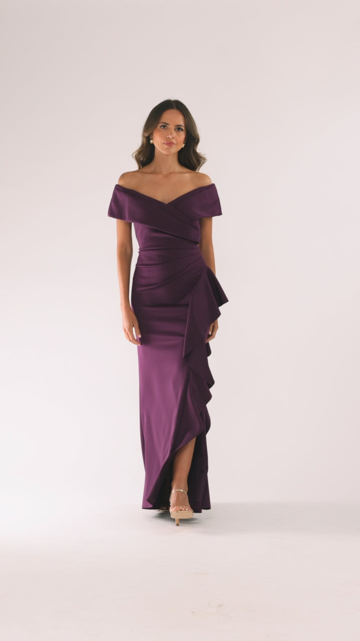 This floor-length dress features an elegant off-the-shoulder design adorned with delicate ruffles, crafted from smooth techno scuba fabric that offers a flattering fit and comfortable stretch. Its sleek silhouette enhances poise and grace, making it perfect for formal events or sophisticated evenings. The structured material ensures a polished look while providing ease of movement, combining style with comfort effortlessly.