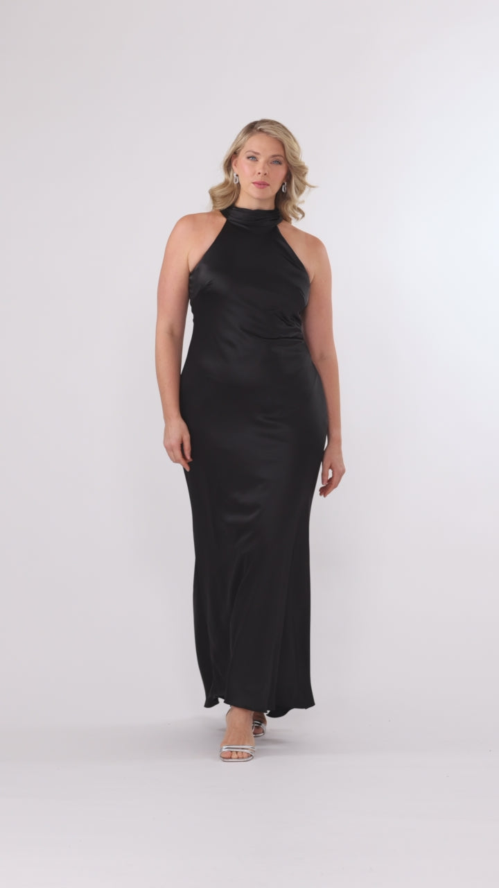 Petite "Ruth" Satin High Tie Neck Backless Floor Length Dress