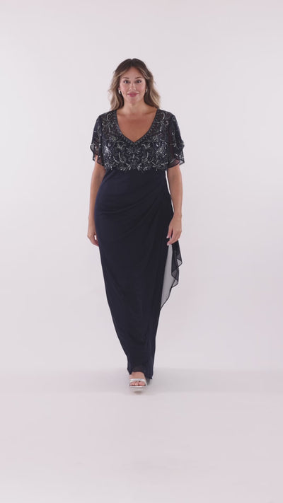 Plus "Giselle" Sheer Jersey Beaded V-Neck Floor Length Dress