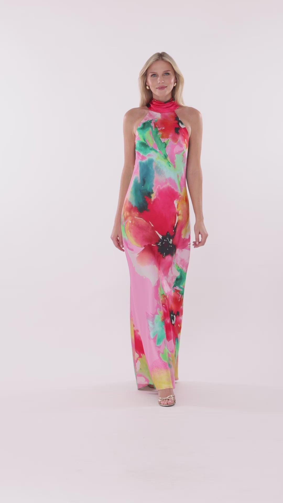A vibrant halter-neck gown featuring a high neckline and a striking watercolor floral print. The fitted bodice flows into a floor-length skirt with soft movement, while the open back with tie detail adds a playful, elegant touch perfect for formal events and destination celebrations.