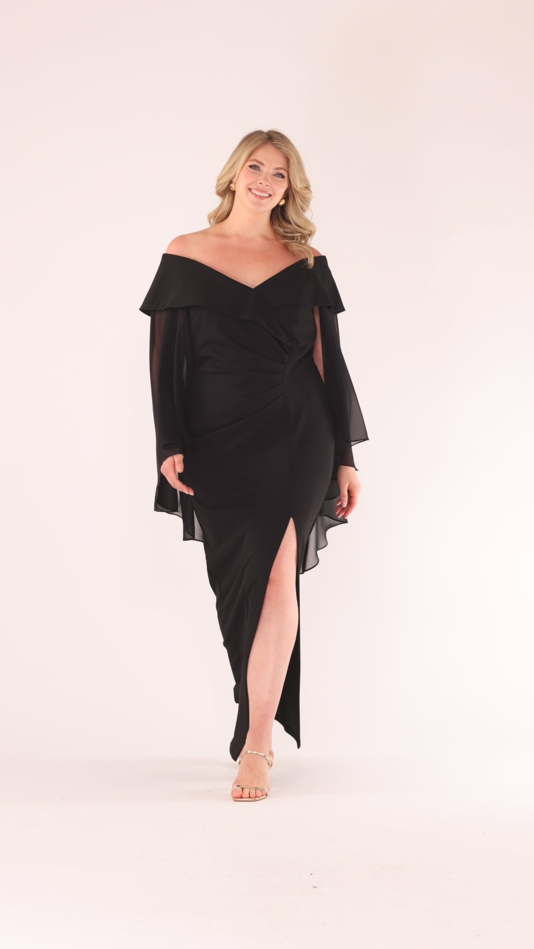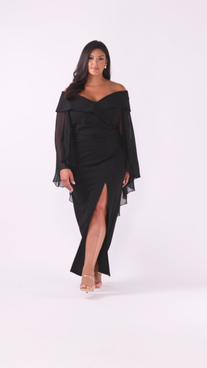 Make a dramatic entrance in this off-the-shoulder plus-size gown, featuring flowing a chiffon cape, flattering side ruching, and a leg-baring slit. Perfect for black-tie events, galas, and weddings where elegance is non-negotiable.