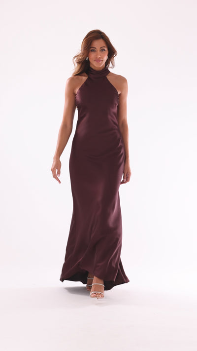 "Ruth" Satin High Tie Neck Backless Floor Length Dress