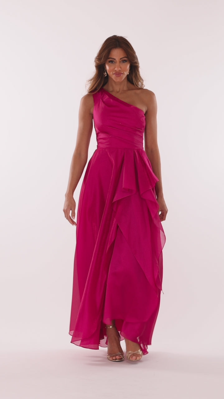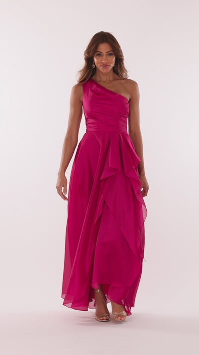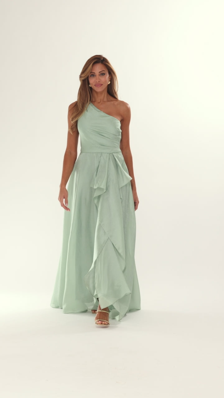 This floor-length dress features a delicate one-shoulder design with elegant organza ruffles that cascade effortlessly, creating a graceful silhouette. Crafted for formal occasions, its lightweight fabric offers both comfort and refinement. Perfect for making a memorable impression at evening events, this dress combines timeless style with a modern touch.