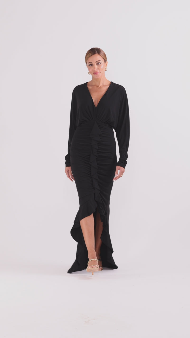 Sophisticated floor-length dress crafted from luxurious jersey knit with strategic ruching along the skirt for a sculpted silhouette. Features an asymmetrical hemline, long sleeves, and a graceful V-neckline that creates an effortlessly elegant look perfect for formal occasions.