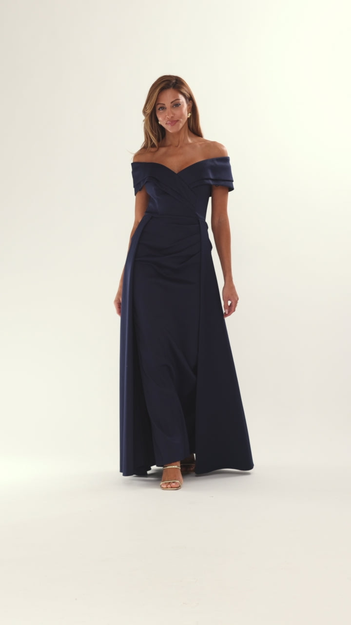 "Tina" Mikado Off the Shoulder Overlay Floor Length Dress