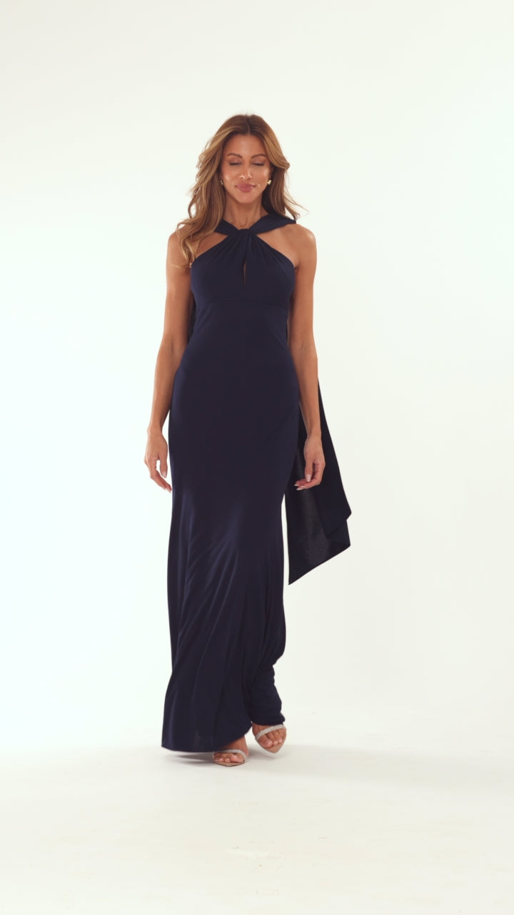 This elegant floor-length gown features a refined halter neckline with a twisted detail and a sleek, fitted silhouette that flatters the figure. Finished with a graceful back drape for added drama and movement, this timeless design is perfect for weddings, galas, black-tie events, and formal evening occasions.