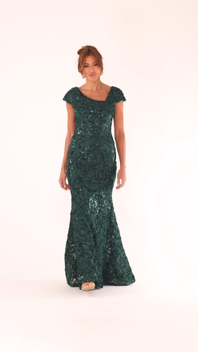 "Viviana" Soutache Cap Sleeve Asymmetric Neckline Floor Length Dress